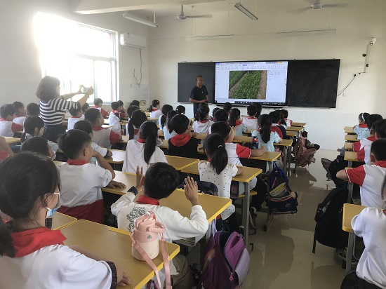 副研究员王红旗首先在教室为孩子们讲解了生活中常见的各种蔬菜品种以及它们的营养价值。当看到熟悉的蔬菜品种时,孩子们抢着回答;遇到不认识的蔬菜品种时,孩子们认真聆听专家的讲解,并提出各种有趣的问题。