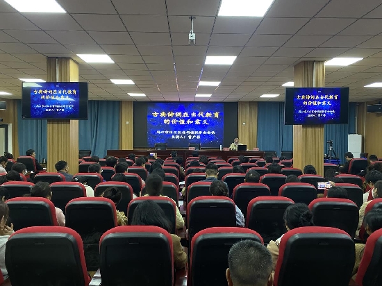 本期培训特邀中华诗词学会会员、中华国风诗词论坛首席版主、第二届醴丰杯全国诗词联赋大奖赛评委、周口市散曲创作研究部部长、周口市诗词楹联学会副会长、川汇区诗词楹联学会会长曾广彬作题为《古典诗词在当代教育的价值和意义》的专题讲座。他从个人层面、社会层面和文化层面分别阐述了从事诗词创作的意义以及古典诗词在当代教育中的价值和意义,并结合经典诗词具体讲述了古典诗词古今发音的不同,讲解了古典诗词中格律诗的韵律方面的有关知识和词学基础知识,使老师们进一步理解了古典诗词在教学上的传承与创新。
