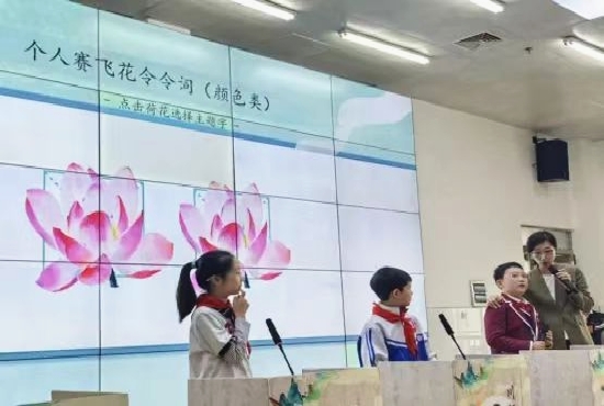 本次大赛分为个人赛和团体赛两个类别。在个人赛阶段,全区各校通过海选脱颖而出的90名选手,分为三组参与“大浪淘沙”笔试答题,优秀选手晋级后续环节。比赛高潮出现在“飞花令”环节,选手围绕“江”“河”“林”等关键词出口成章、佳句频出,将激烈的竞技转化为一场诗词交流的盛宴。选手们扎实的诗词功底与镇定自若的临场表现,赢得了评委及在场师生的一致好评。