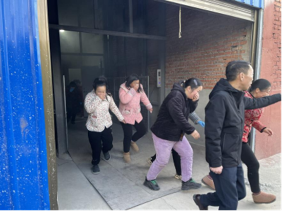 随着警报声骤然响起,窗帘厂职工捂住口鼻,低弯着腰,迅速、有序地跑出工厂,紧急疏散撤离至安全区域,整个疏散过程井然有序、行动迅速。