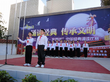 为弘扬民族优秀传统文化,提高学生的语言表达能力和文化修养,在国庆节之际,川汇区文明办、川汇区教体局组织全区青少年学生在七一路第一小学开展了一场以“诵读经典、传承文明”为主题的迎中秋、庆国庆中华经典诵读比赛。来自全区10所学校的200多名学生参加了此次比赛。据了解,这次大赛以朗诵传统经典为主题,参赛作品均出自各年级课本和《中华经典诵读读本》。